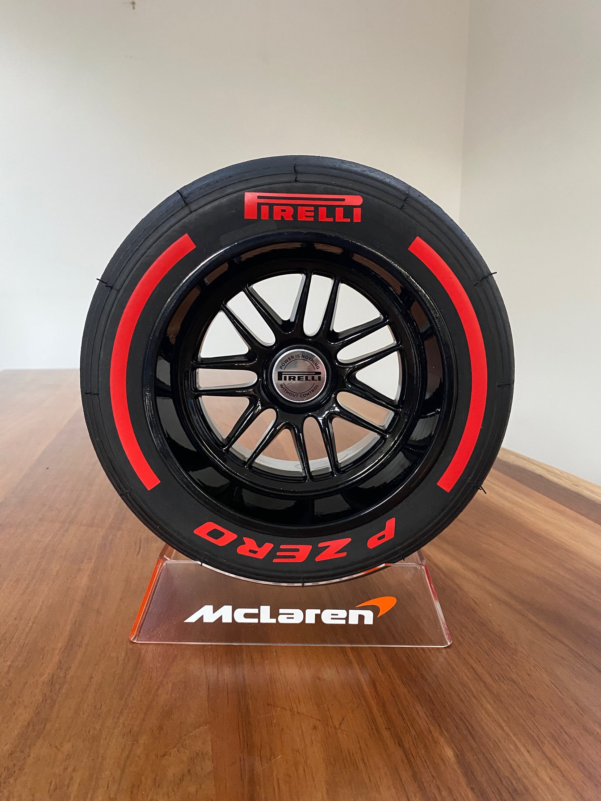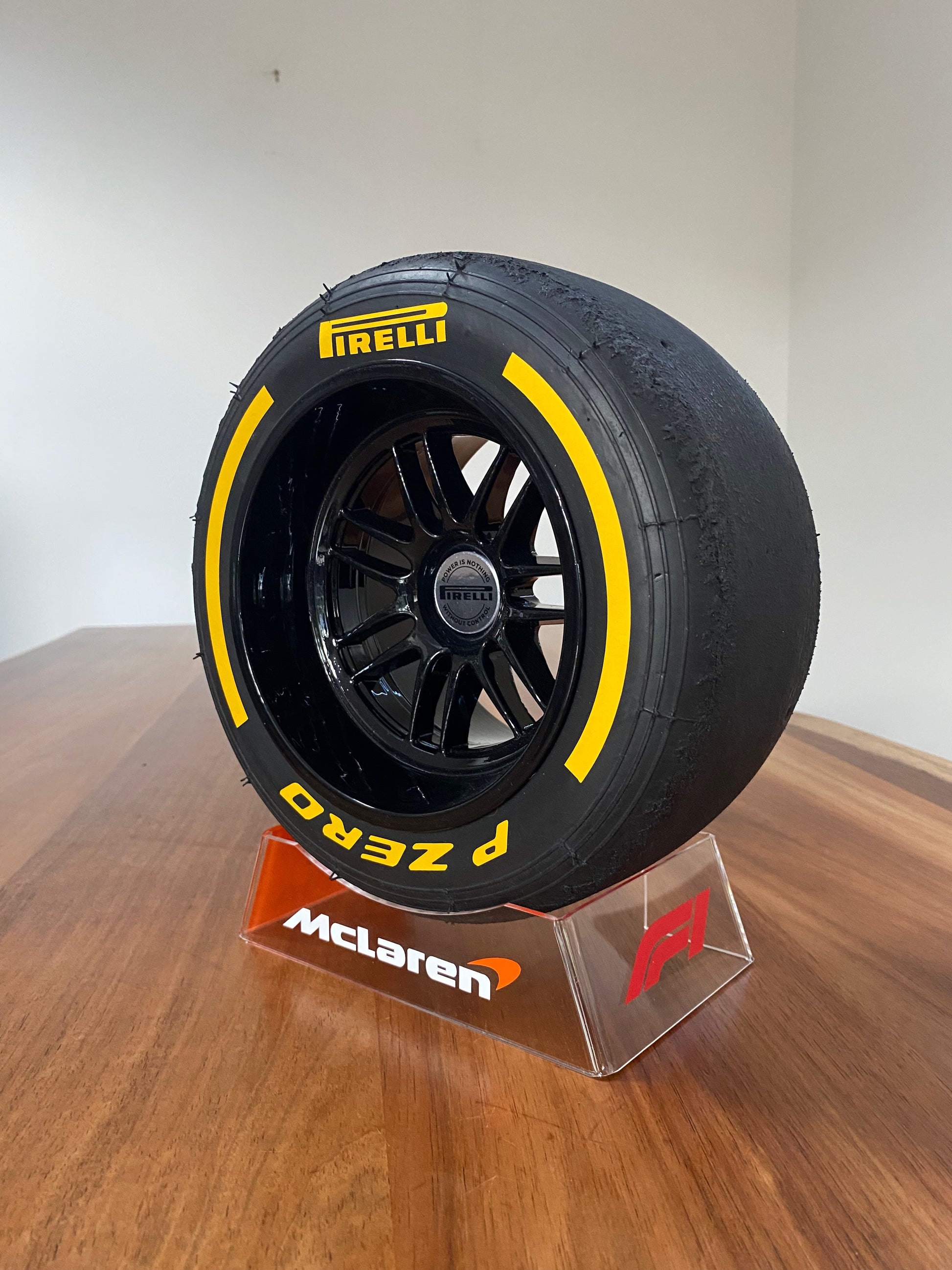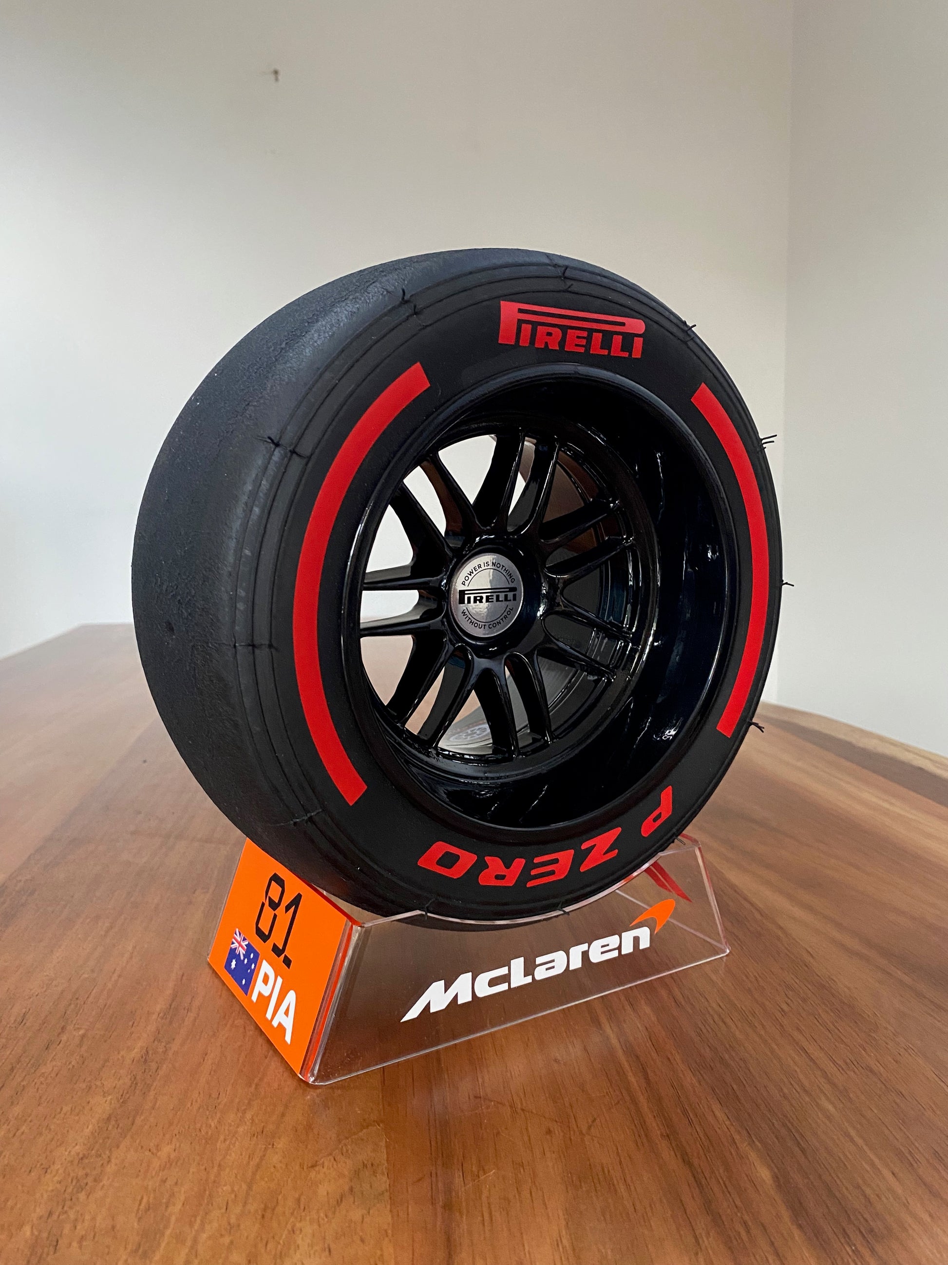 This is a 1/3 scale replica Formula 1 wheel, comes complete with a unique display stand which sports the McLaren livery and Oscar's number. NEW 2025 wheel in gloss black representing the current F1 18" wheels (2022 onwards)